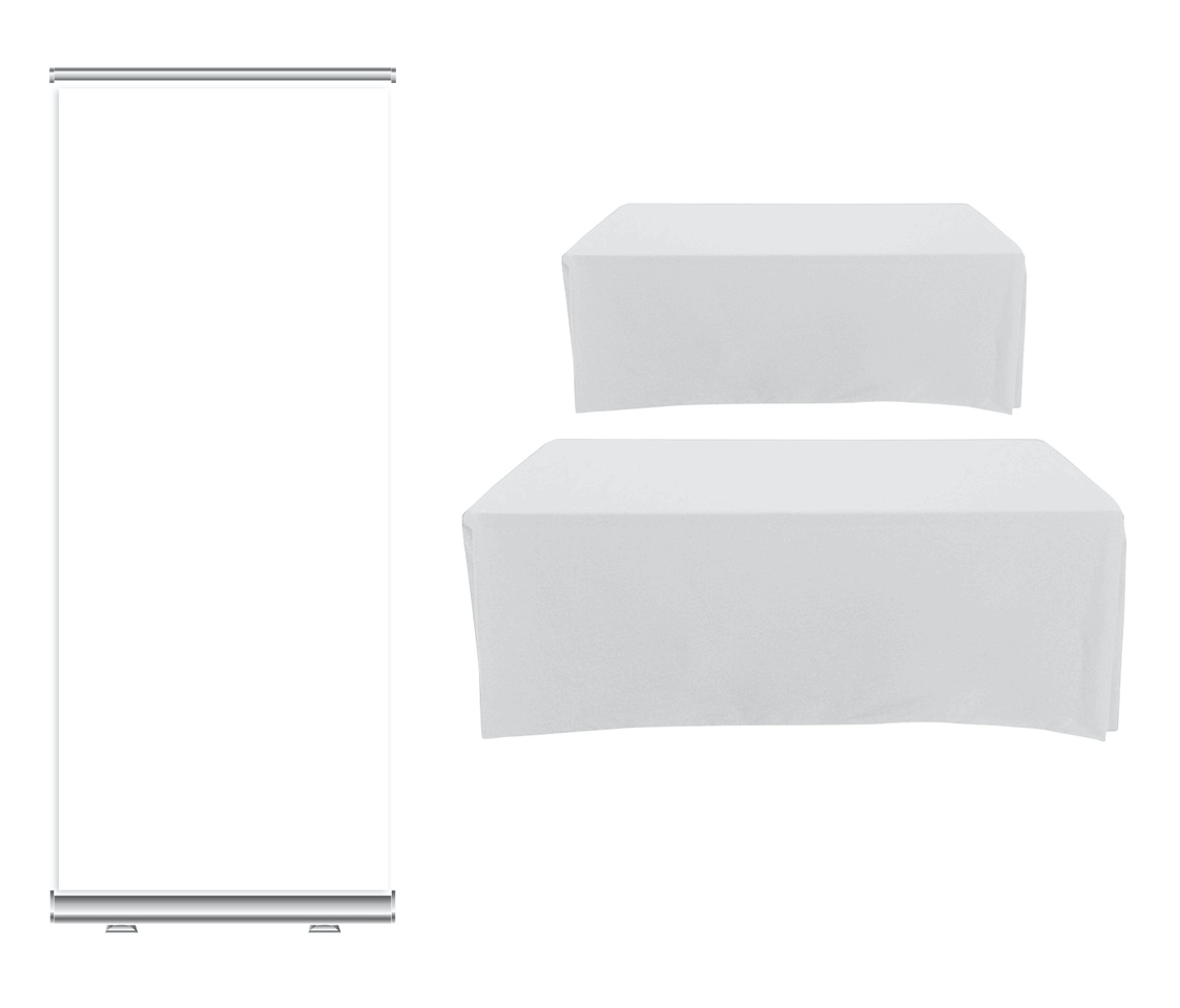 • Deluxe Wide Base banner (DP652) and a Premium sublimated table cloth (SU811) for a 6' table, Closed Back.